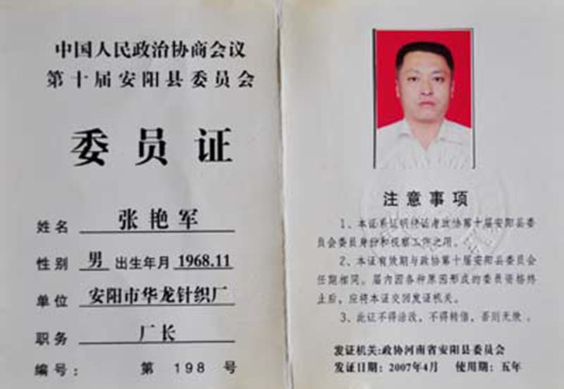 中國(guó)人民政治協(xié)商會(huì)議第十屆安陽(yáng)縣委員會(huì)委員證